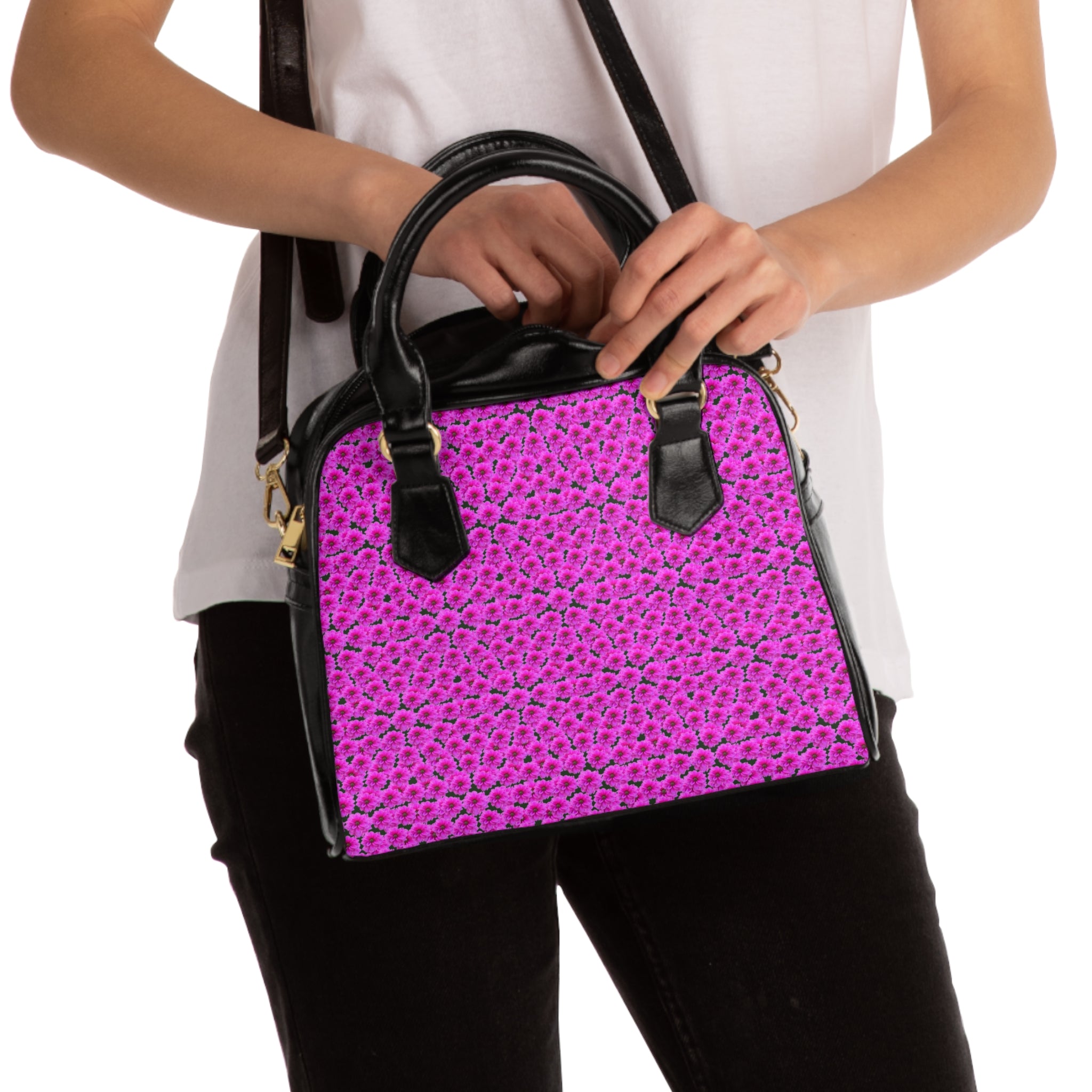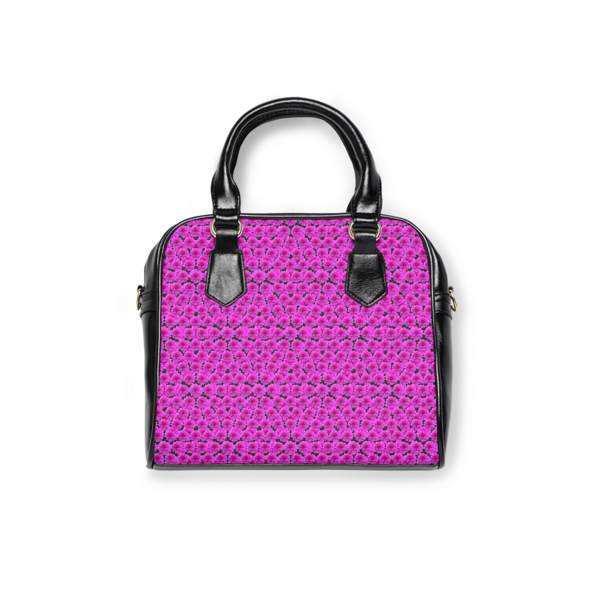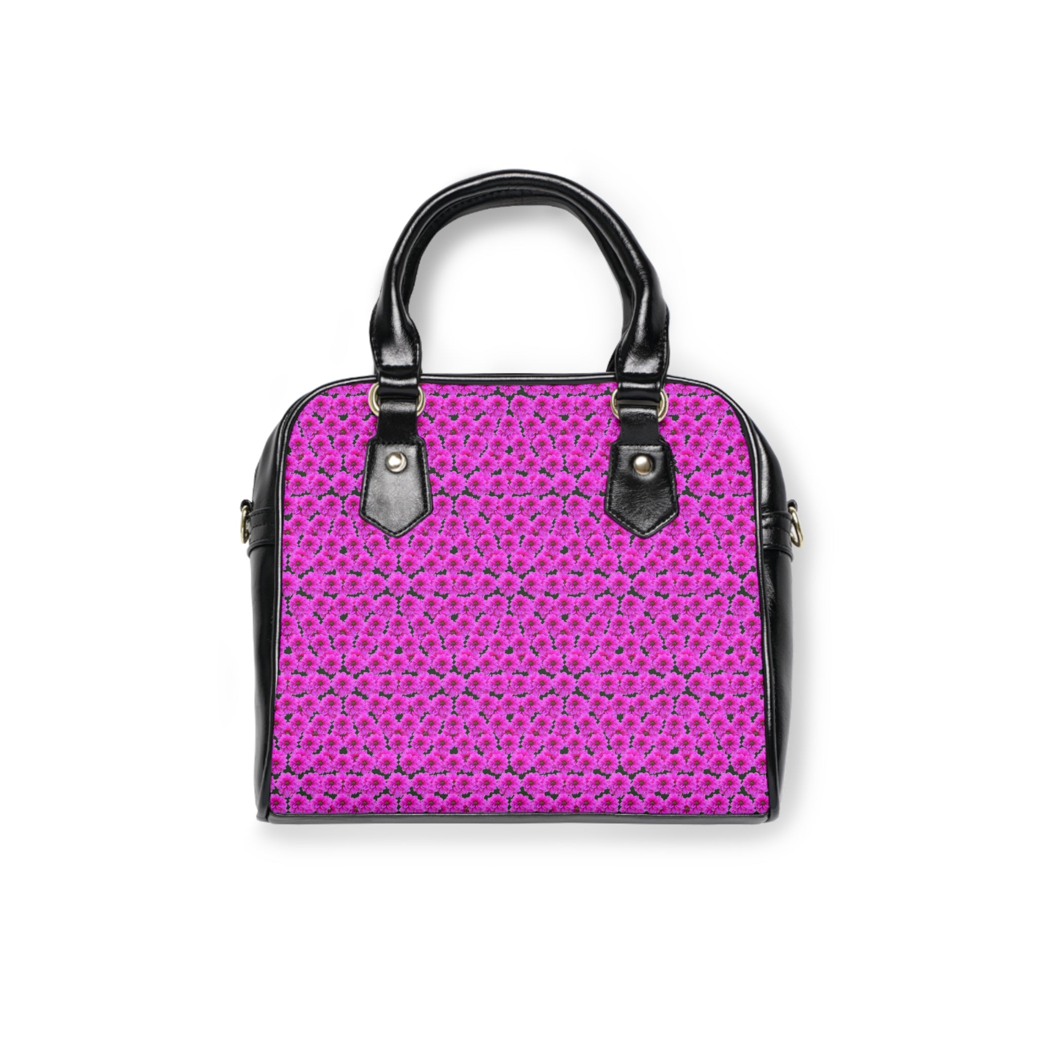 Floral texture with a sculpted twist. This structured shoulder handbag features the Victoria Island Dahlias “Puffy” Pattern — a layered composition created by placing dahlias on top of dahlias from an original garden photograph captured on Victoria Island, Canada. The overlapping blooms create depth and dimension, giving the bag a soft, almost quilted visual effect while maintaining a polished silhouette.