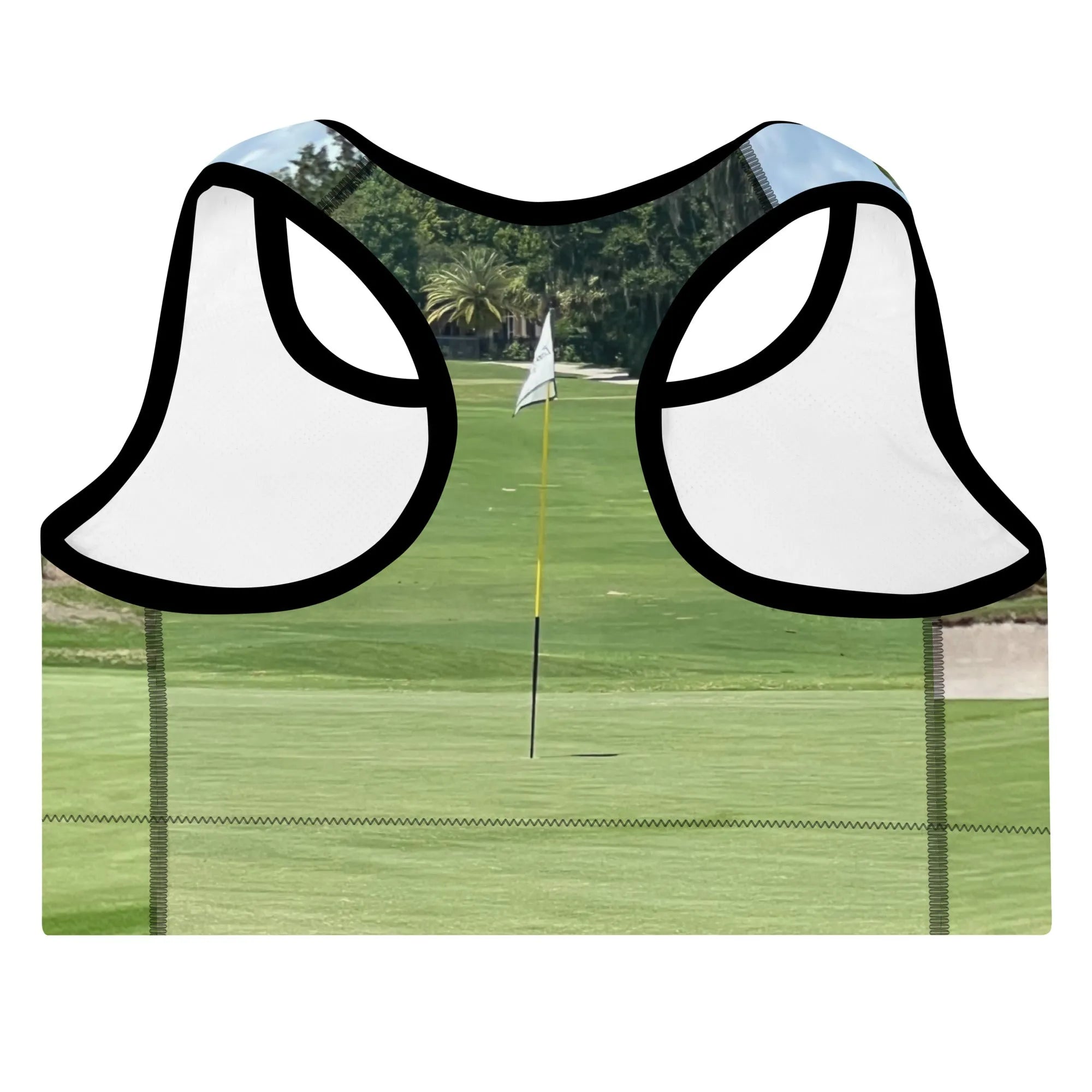 Embrace the classic charm of the greens with this sports bra, featuring a scenic golf course design. Perfect for golf enthusiasts and lovers of the outdoors.